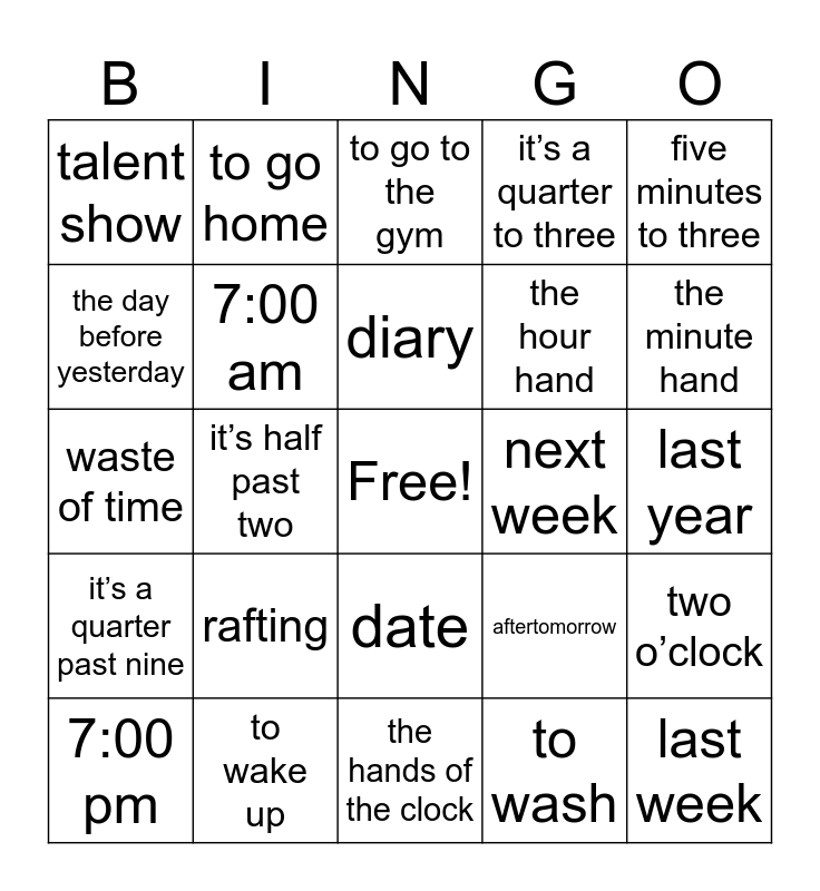 This bingo card has a free space and 39 words: campfire, arts and crafts, appointment, 7:00 am, 7:00 pm, date, diary, drama, five minutes to three, it’s a quarter past nine, it’s half past two, it’s a quarter to three, last week, last year, next week, rafting, schedule, talent show, the day, aftertomorrow, the day before yesterday, the hands of the clock, the hour hand, the minute hand, to be early, to be late, to brush my teeth, to do homework, to get dressed, to go home, to go to bed, to go to school/work, to go to the gym, to wake up, to wash, twenty minutes to eight, two o’clock, waste of time and to yawn.