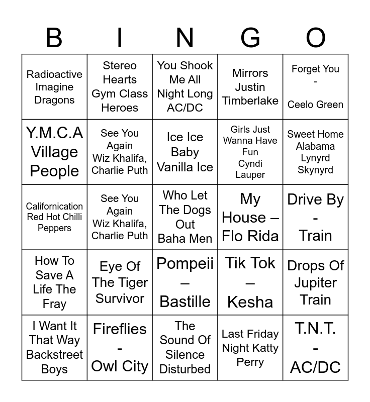 This bingo card has a free space and 24 words: Eye Of The Tiger Survivor, Fireflies - Owl City, Ice Ice Baby Vanilla Ice, I Want It That Way Backstreet Boys, Forget You - Ceelo Green, Radioactive Imagine Dragons, Y.M.C.A Village People, Stereo Hearts Gym Class Heroes, My House – Flo Rida, Pompeii – Bastille, Girls Just Wanna Have Fun Cyndi Lauper, Californication Red Hot Chilli Peppers, Tik Tok – Kesha, Drops Of Jupiter Train, See You Again Wiz Khalifa, Charlie Puth, Last Friday Night Katty Perry, Drive By - Train, You Shook Me All Night Long AC/DC, Sweet Home Alabama Lynyrd Skynyrd, See You Again Wiz Khalifa, Charlie Puth, T.N.T. - AC/DC, How To Save A Life The Fray, Mirrors Justin Timberlake and The Sound Of Silence Disturbed.