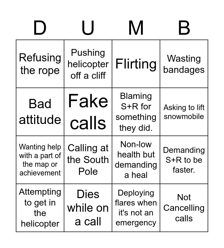 This bingo card has 17 words: Deploying flares when it's not an emergency, Attempting to get in the helicopter, Flirting, Refusing the rope, Calling at the South Pole, Wasting bandages, Demanding S+R to be faster., Blaming S+R for something they did., Asking to lift snowmobile, Fake calls, Dies while on a call, Non-low health but demanding a heal, Bad attitude, Pushing helicopter off a cliff, Wanting help with a part of the map or achievement, Repetitive rule breaks. and Not Cancelling calls.