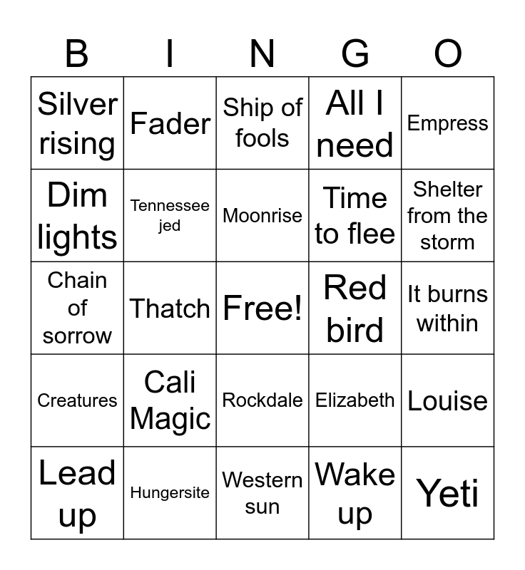 This bingo card has a free space and 24 words: Cali Magic, Hungersite, Moonrise, Lead up, Empress, Silver rising, Dim lights, Fader, Red bird, Rockdale, Time to flee, Chain of sorrow, Elizabeth, Louise, Tennessee jed, Wake up, It burns within, Ship of fools, Shelter from the storm, Thatch, Yeti, Creatures, All I need and Western sun.