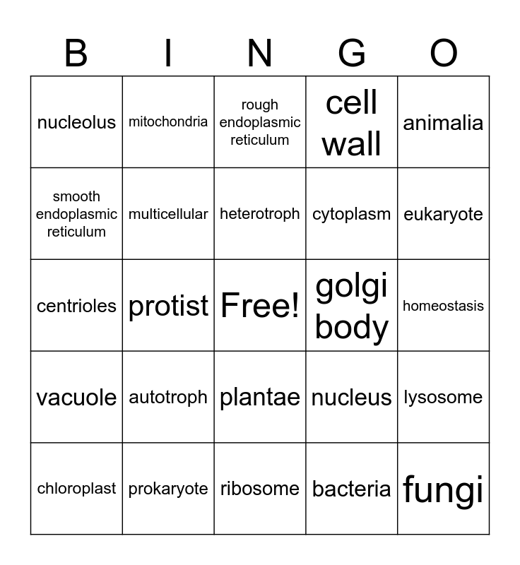 This bingo card has a free space and 27 words: nucleus, cell membrane, cytoplasm, ribosome, smooth endoplasmic reticulum, rough endoplasmic reticulum, mitochondria, vacuole, golgi body, lysosome, centrioles, cell wall, chloroplast, prokaryote, eukaryote, unicellular, multicellular, heterotroph, autotroph, nucleolus, homeostasis, bacteria, protist, fungi, plantae, animalia and photosynthesis.