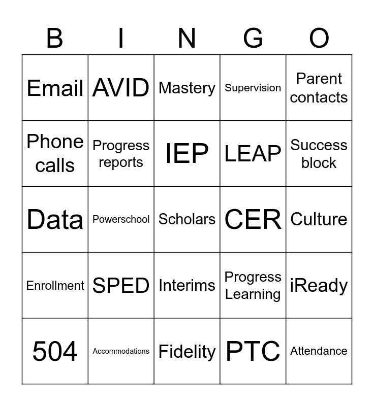 This bingo card has a free space and 24 words: SPED, Accommodations, IEP, 504, Parent contacts, Email, Phone calls, AVID, CER, Interims, LEAP, Data, Progress Learning, iReady, Progress reports, PTC, Culture, Mastery, Success block, Powerschool, Attendance, Enrollment, Supervision and Fidelity.