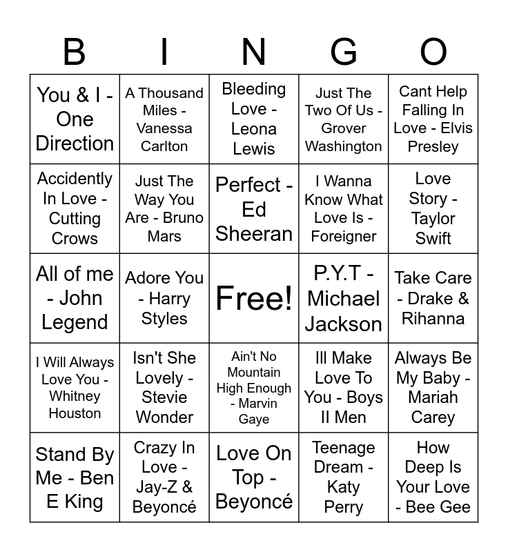 This bingo card has a free space and 24 words: Isn't She Lovely - Stevie Wonder, Crazy In Love - Jay-Z & Beyoncé, Perfect - Ed Sheeran, Stand By Me - Ben E King, Cant Help Falling In Love - Elvis Presley, You & I - One Direction, Accidently In Love - Cutting Crows, A Thousand Miles - Vanessa Carlton, P.Y.T - Michael Jackson, Ain't No Mountain High Enough - Marvin Gaye, I Wanna Know What Love Is - Foreigner, All of me - John Legend, Ill Make Love To You - Boys II Men, Always Be My Baby - Mariah Carey, Just The Way You Are - Bruno Mars, Teenage Dream - Katy Perry, Take Care - Drake & Rihanna, Bleeding Love - Leona Lewis, Love Story - Taylor Swift, Adore You - Harry Styles, How Deep Is Your Love - Bee Gee, I Will Always Love You - Whitney Houston, Just The Two Of Us - Grover Washington and Love On Top - Beyoncé.