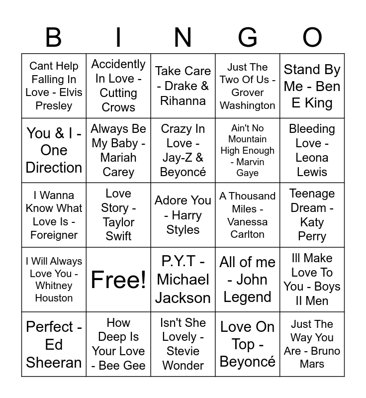 This bingo card has 25 words: Free!, Isn't She Lovely - Stevie Wonder, Crazy In Love - Jay-Z & Beyoncé, Perfect - Ed Sheeran, Stand By Me - Ben E King, Cant Help Falling In Love - Elvis Presley, You & I - One Direction, Accidently In Love - Cutting Crows, A Thousand Miles - Vanessa Carlton, P.Y.T - Michael Jackson, Ain't No Mountain High Enough - Marvin Gaye, I Wanna Know What Love Is - Foreigner, All of me - John Legend, Ill Make Love To You - Boys II Men, Always Be My Baby - Mariah Carey, Just The Way You Are - Bruno Mars, Teenage Dream - Katy Perry, Take Care - Drake & Rihanna, Bleeding Love - Leona Lewis, Love Story - Taylor Swift, Adore You - Harry Styles, How Deep Is Your Love - Bee Gee, I Will Always Love You - Whitney Houston, Just The Two Of Us - Grover Washington and Love On Top - Beyoncé.