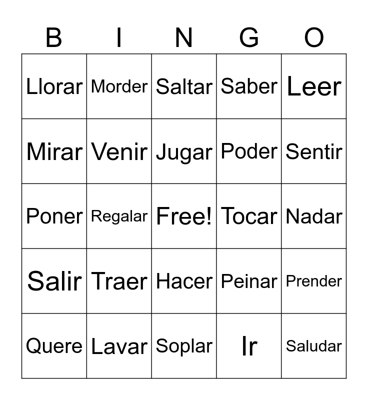 This bingo card has a free space and 26 words: Hacer, Ir, Jugar, Lavar, Leer, Llorar, Mirar, Morder, Nadar, Peinar, Poder, Poner, Prender, Quere, Regalar, Romper, Saber, Salir, Saltar, Saludar, Sentir, Soplar, Tocar, Traer, Venir and Ver.