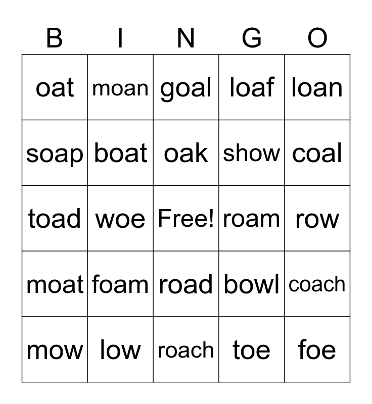 This bingo card has a free space and 24 words: foam, low, oak, mow, loan, oat, soap, moan, roam, road, show, toad, bowl, coach, boat, toe, row, goal, coal, woe, foe, moat, loaf and roach.