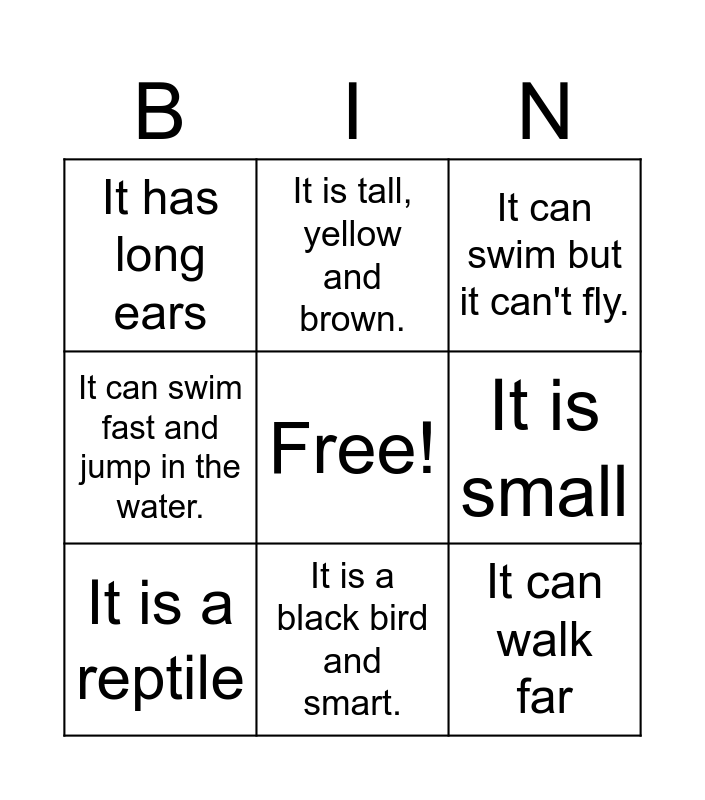 This bingo card has a free space and 12 words: It has strong arms, It can run fast, It can walk far, It is small, It is tall, yellow and brown., It can swim but it can't fly., It is a black bird and smart., It can jump high, It has long ears, It can swim fast and jump in the water., It is a reptile and It is a fish. It can swim fast.