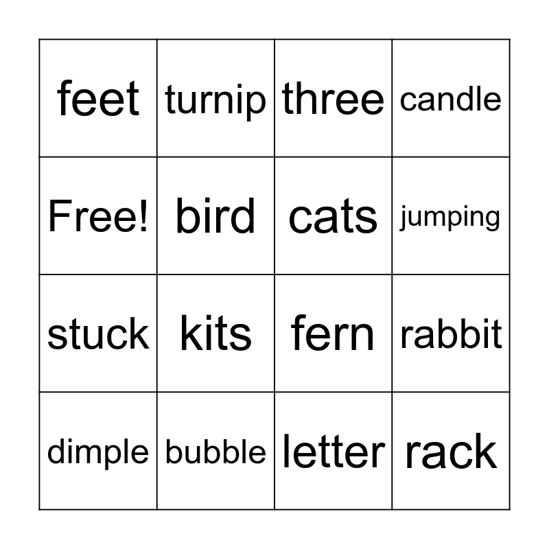 This bingo card has 16 words: bubble, rabbit, three, feet, stuck, turnip, fern, letter, Free!, bird, dimple, candle, kits, jumping, cats and rack.