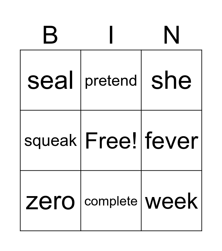 This bingo card has a free space and 15 words: eve, creek, she, seal, complete, week, we, meal, meeting, zero, wheat, fever, squeak, pretend and people.