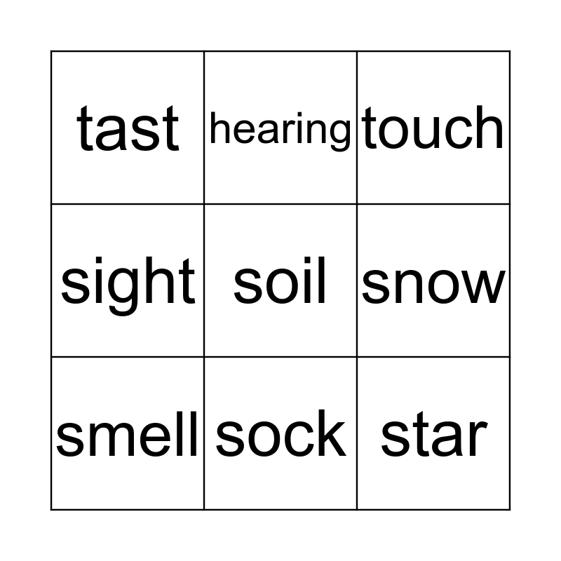 This bingo card has 9 words: smell, touch, hearing, sight, tast, snow, soil, star and sock.
