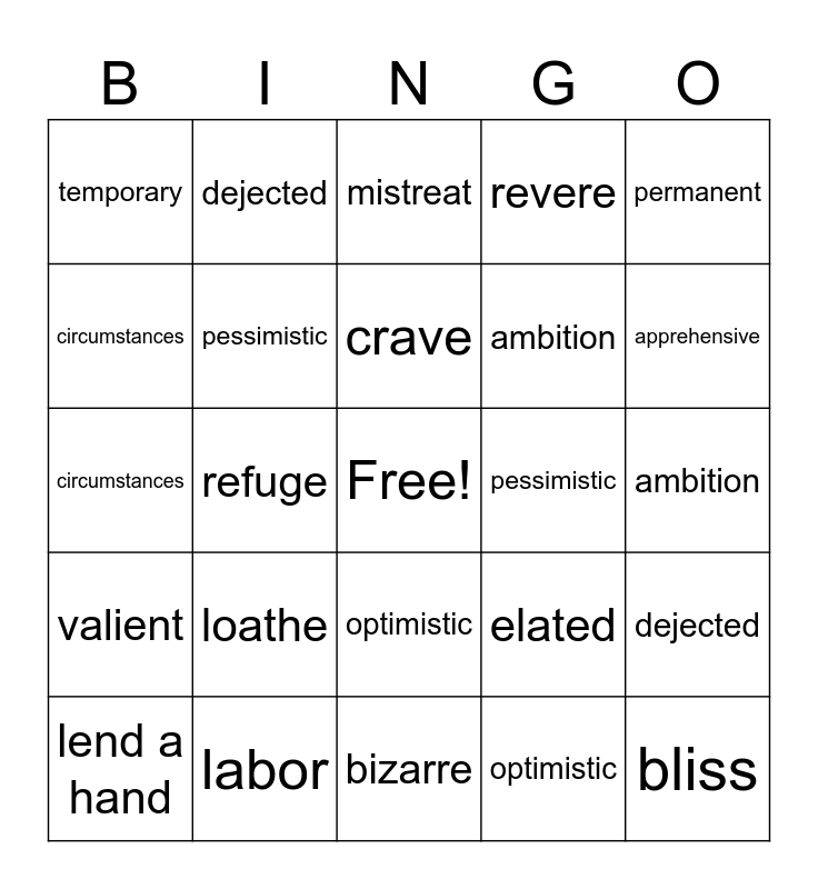 This bingo card has a free space and 24 words: loathe, labor, crave, lend a hand, permanent, temporary, circumstances, dejected, pessimistic, optimistic, ambition, circumstances, elated, dejected, pessimistic, optimistic, ambition, mistreat, apprehensive, refuge, bliss, valient, revere and bizarre.