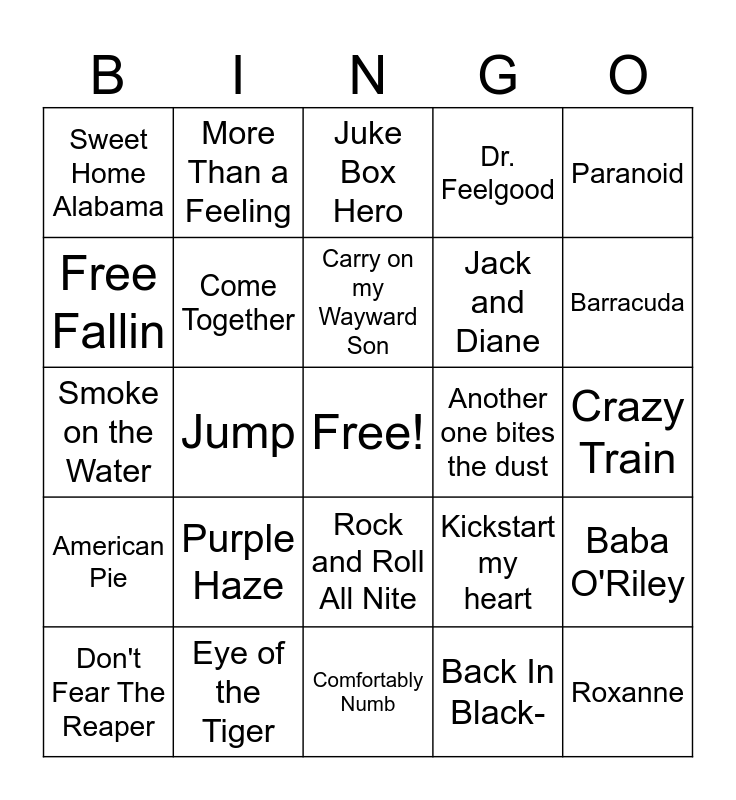 This bingo card has a free space and 34 words: Renegade, Back In Black-, Sweet Emotion, Life in the fast lane, American Pie, Come Together, Paranoid, Don't Fear The Reaper, More Than a Feeling, Born to Run, Carry on my Wayward Son, Juke Box Hero, Take it Easy, Bohemian Rhapsody, Another one bites the dust, Barracuda, Eye of the Tiger, Smoke on the Water, Purple Haze, Kickstart my heart, Rock and Roll All Nite, Black Dog, Sweet Home Alabama, Crazy Train, Comfortably Numb, Roxanne, Dr. Feelgood, Sunshine of your love, Jack and Diane, Free Fallin, Tom Sawyer, Jump, Baba O'Riley and Sharp Dressed Man.