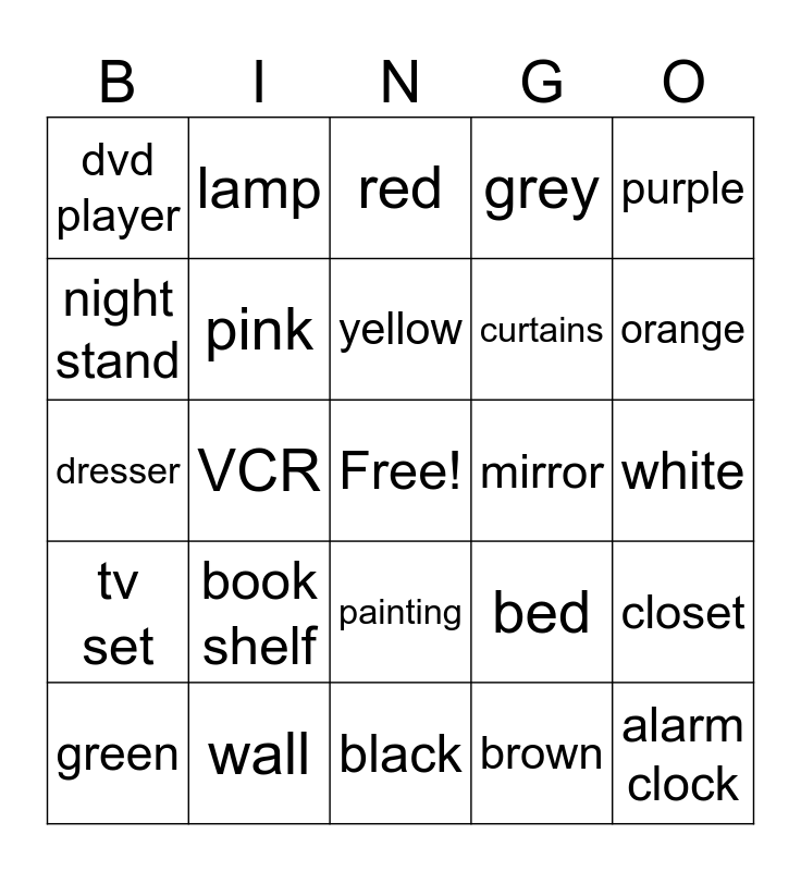 This bingo card has a free space and 24 words: book shelf, wall, yellow, green, purple, dvd player, night stand, lamp, mirror, painting, curtains, dresser, bed, closet, pink, brown, white, red, orange, VCR, alarm clock, tv set, grey and black.