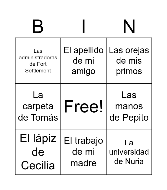 This bingo card has a free space and 11 words: El hermano de Lucas, El trabajo de mi madre, La universidad de Nuria, El lápiz de Cecilia, El apellido de mi amigo, Las orejas de mis primos, Las manos de Pepito, El gato de mi abuela, La carpeta de Tomás, Las administradoras de Fort Settlement and Las escuelas del distrito.