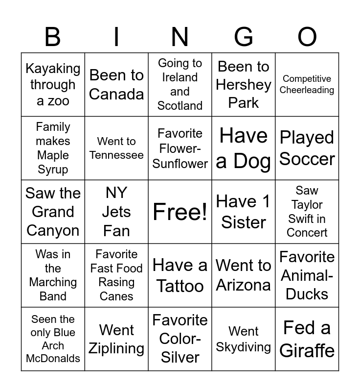 This bingo card has a free space and 24 words: Favorite Fast Food Rasing Canes, Went Ziplining, Favorite Flower- Sunflower, Seen the only Blue Arch McDonalds, Competitive Cheerleading, Kayaking through a zoo, Family makes Maple Syrup, Been to Canada, Have 1 Sister, Have a Tattoo, Have a Dog, Saw the Grand Canyon, Went to Arizona, Favorite Animal- Ducks, Went to Tennessee, Went Skydiving, Saw Taylor Swift in Concert, Going to Ireland and Scotland, Played Soccer, NY Jets Fan, Fed a Giraffe, Was in the Marching Band, Been to Hershey Park and Favorite Color- Silver.