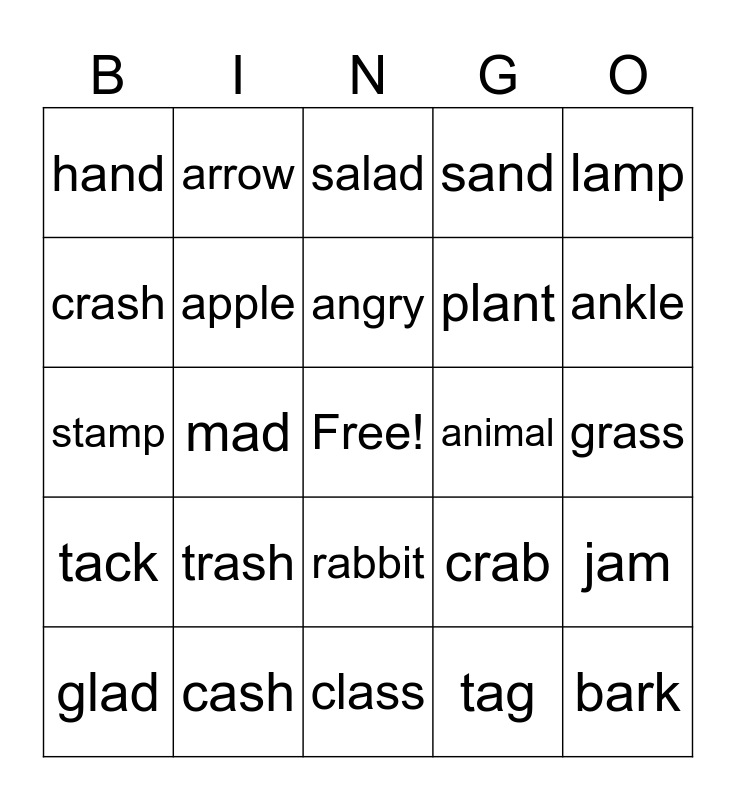 This bingo card has a free space and 34 words: flag, tag, bag, cab, tack, apple, lamp, glad, arrow, axe, angry, salad, napkin, wagon, animal, ankle, cash, stamp, trash, crab, rabbit, bank, hand, grass, class, bark, sand, bath, plant, crash, basket, mad, jam and snack.