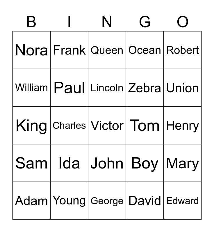 This bingo card has a free space and 24 words: Adam, Ida, Lincoln, David, Robert, Nora, Frank, Queen, Tom, Henry, King, Paul, Boy, Mary, William, Young, George, Ocean, Union, Sam, Charles, John, Zebra and Edward.