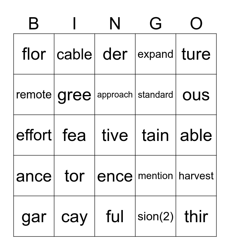 This bingo card has 29 words: gar, tur, fea, thir, flor, der, gree, tor, tain, cay, able, tive, ful, sion(2), ous, ive, ence, ance, ture, effort, mention, excite, standard, remote, expand, cable, harvest, approach and alarm.