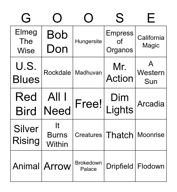 This bingo card has a free space and 24 words: It Burns Within, Arrow, Madhuvan, Animal, California Magic, Elmeg The Wise, U.S. Blues, Bob Don, Dim Lights, Creatures, Mr. Action, Red Bird, Thatch, Moonrise, Rockdale, Dripfield, Arcadia, Hungersite, A Western Sun, All I Need, Flodown, Silver Rising, Empress of Organos and Brokedown Palace.