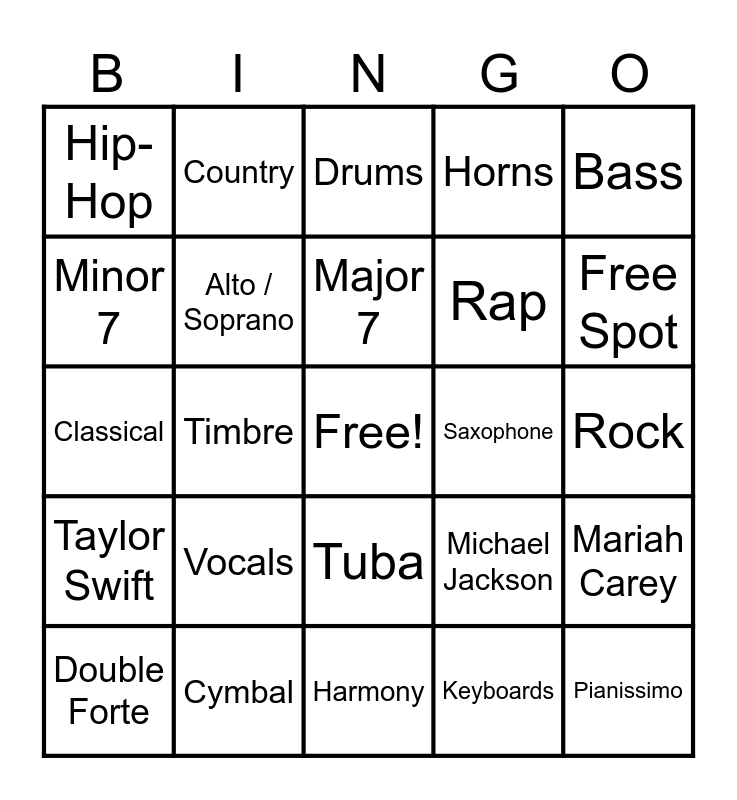 This bingo card has a free space and 43 words: Piano, Pianissimo, Forte, Double Forte, Tempo, Keyboards, Drums, Guitar, Bass, Cymbal, Horns, Saxophone, Tuba, Vocals, Chords, Harmony, Choir, Classical, Jazz, Free Spot, Country, Blues, Opera, Hip-Hop, R&B, Rock, Pop-Rock, K-pop, Michael Jackson, Taylor Swift, Garth Brooks, Mariah Carey, Doja Cat, Timbre, Major, Minor, Diminished, Major 7, Minor 7, Rap, Tenor, Alto / Soprano and Folk.