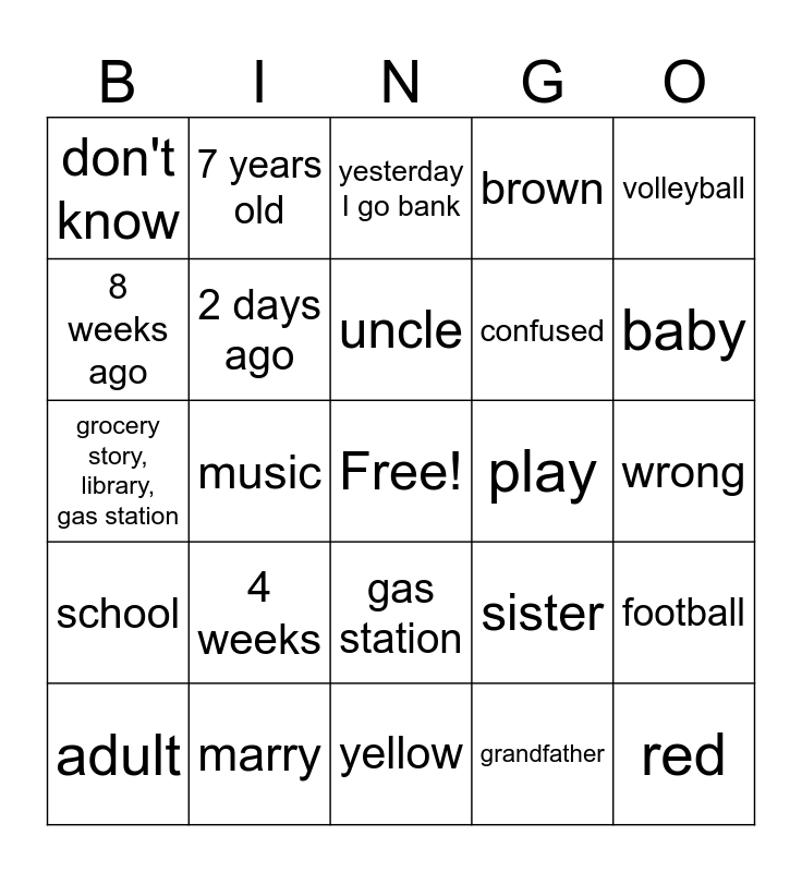 This bingo card has a free space and 49 words: pink, red, green, yellow, 4 weeks, 2 months, 7 years old, 3 years old, 8 weeks ago, in 4 days, 2 days ago, brown, football, sister, female cousin, cousin, uncle, play, party, volleyball, music, grandfather, don't know, confused, young, baby, adult, library, gas station, school, bank, college, divorce, good friend, marry, neighbor, neighborhood, people, wrong, smart, understand, obvious, dog, dog, cat, boy girl boy boy, grocery story, library, gas station, yesterday I go bank, yesterday I go park, tomorrow I go library and tomorrow I go park.