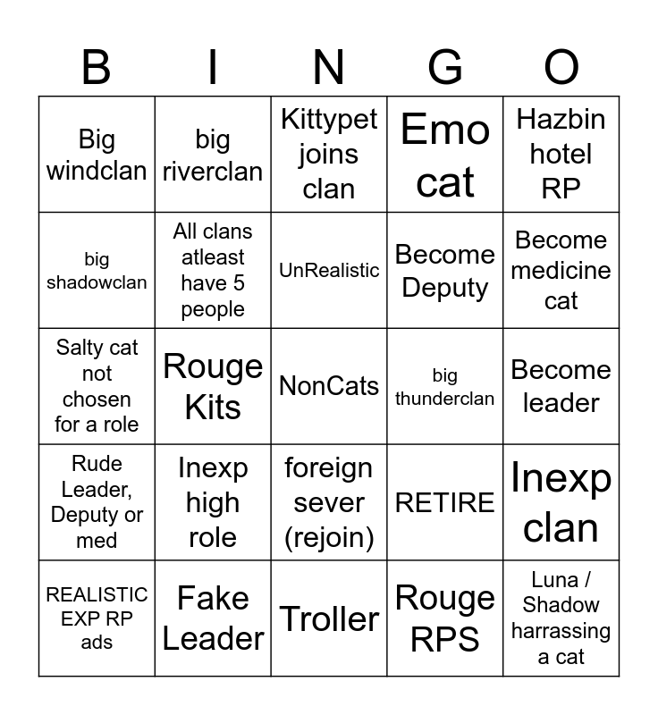 This bingo card has a free space and 24 words: Inexp high role, Fake Leader, UnRealistic, REALISTIC EXP RP ads, Hazbin hotel RP, Big windclan, big shadowclan, big riverclan, big thunderclan, foreign sever (rejoin), Become Deputy, Salty cat not chosen for a role, RETIRE, Inexp clan, All clans atleast have 5 people, Rouge RPS, Become leader, Kittypet joins clan, Become medicine cat, Rouge Kits, Luna / Shadow harrassing a cat, Rude Leader, Deputy or med, Emo cat and Troller.