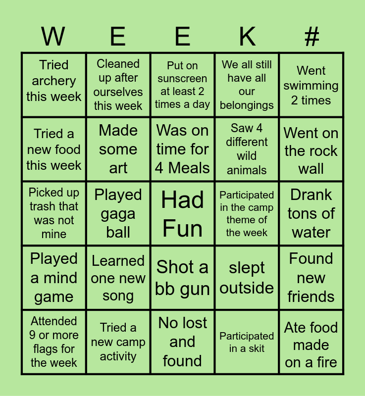 This bingo card has a free space and 24 words: Learned one new song, Tried a new camp activity, Was on time for 4 Meals, Attended 9 or more flags for the week, Went swimming 2 times, Tried archery this week, Tried a new food this week, Cleaned up after ourselves this week, Participated in the camp theme of the week, Shot a bb gun, Saw 4 different wild animals, Picked up trash that was not mine, slept outside, Found new friends, Made some art, Participated in a skit, Drank tons of water, Put on sunscreen at least 2 times a day, Went on the rock wall, Played gaga ball, Ate food made on a fire, Played a mind game, We all still have all our belongings and No lost and found.