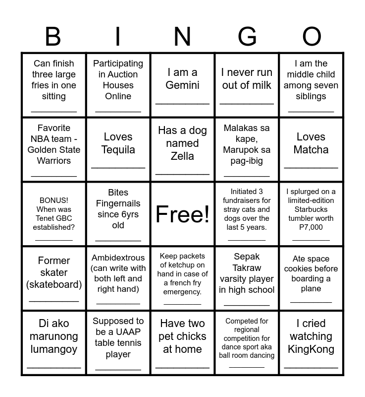 This bingo card has a free space and 24 words: Ambidextrous (can write with both left and right hand) _________, Supposed to be a UAAP table tennis player _________, Has a dog named Zella _________, Di ako marunong lumangoy _________, I am the middle child among seven siblings _________, Can finish three large fries in one sitting _________, Favorite NBA team - Golden State Warriors _________, Participating in Auction Houses Online _________, Initiated 3 fundraisers for stray cats and dogs over the last 5 years. _________, Keep packets of ketchup on hand in case of a french fry emergency. _________, Malakas sa kape, Marupok sa pag-ibig _________, BONUS! When was Tenet GBC established? _________, Sepak Takraw varsity player in high school _________, Ate space cookies before boarding a plane _________, Loves Tequila _________, Competed for regional competition for dance sport aka ball room dancing _________, I splurged on a limited-edition Starbucks tumbler worth P7,000 _________, I am a Gemini _________, Loves Matcha _________, Bites Fingernails since 6yrs old _________, I cried watching KingKong _________, Former skater (skateboard) _________, I never run out of milk _________ and Have two pet chicks at home _________.