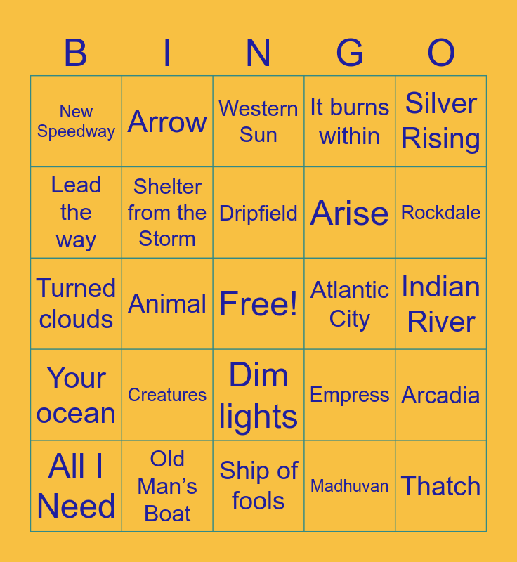 This bingo card has a free space and 24 words: All I Need, Creatures, Dripfield, Madhuvan, Silver Rising, New Speedway, Arrow, Western Sun, Atlantic City, Indian River, Turned clouds, Shelter from the Storm, Empress, Arcadia, Lead the way, Old Man’s Boat, Ship of fools, It burns within, Rockdale, Your ocean, Animal, Dim lights, Arise and Thatch.