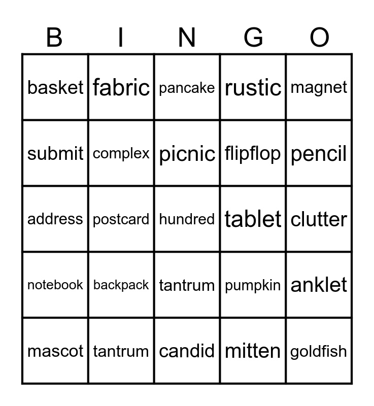 This bingo card has a free space and 24 words: backpack, tantrum, picnic, mascot, magnet, basket, submit, fabric, tablet, tantrum, flipflop, address, pumpkin, anklet, complex, mitten, clutter, pancake, pencil, postcard, goldfish, notebook, rustic and candid.