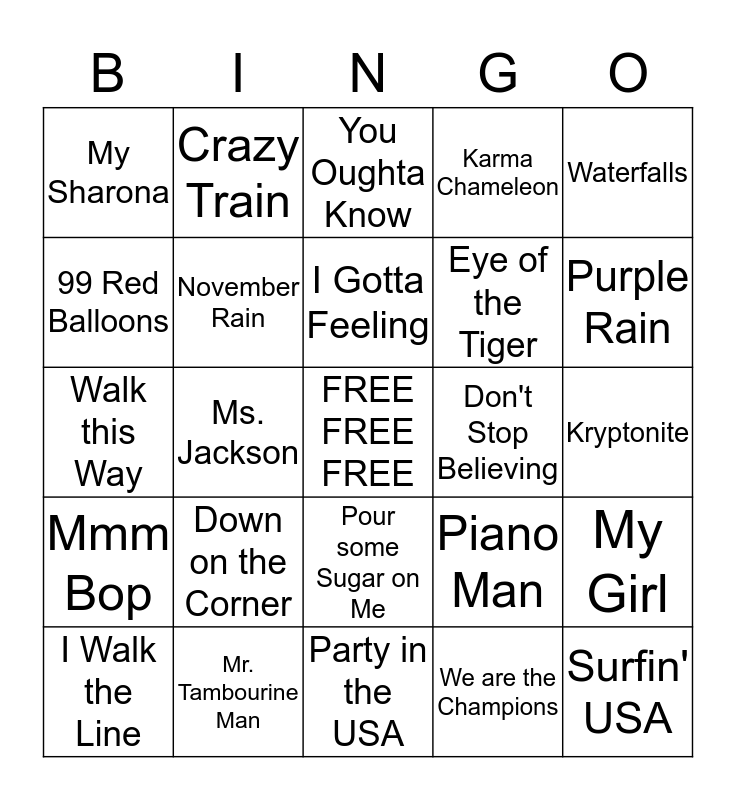 This bingo card has a free space and 24 words: Down on the Corner, Mr. Tambourine Man, I Gotta Feeling, I Walk the Line, Waterfalls, My Sharona, 99 Red Balloons, Crazy Train, Don't Stop Believing, Pour some Sugar on Me, Eye of the Tiger, Walk this Way, Piano Man, My Girl, November Rain, We are the Champions, Kryptonite, You Oughta Know, Purple Rain, Ms. Jackson, Surfin' USA, Mmm Bop, Karma Chameleon and Party in the USA.