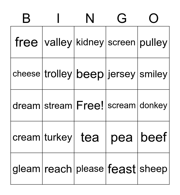 This bingo card has a free space and 24 words: turkey, reach, beep, gleam, pulley, free, cheese, valley, scream, tea, jersey, dream, pea, beef, trolley, feast, donkey, kidney, smiley, stream, sheep, cream, screen and please.