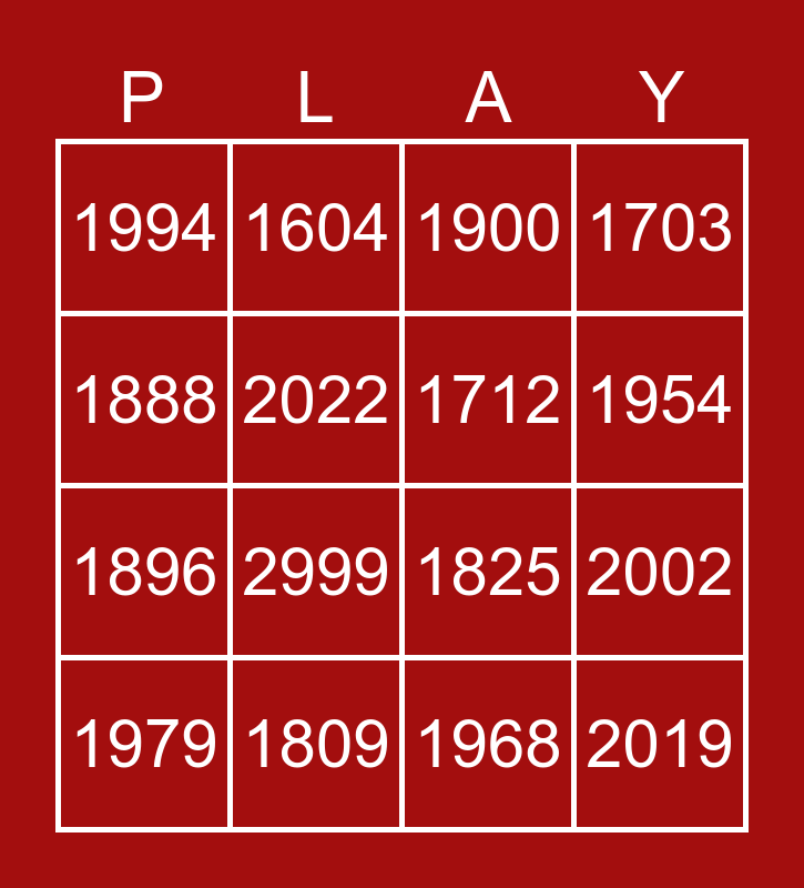 This bingo card has 32 words: 1961, 1850, 2002, 1909, 2019, 1712, 1888, 1737, 1604, 2010, 1954, 1900, 1766, 1842, 1809, 1919, 2012, 1825, 1704, 1989, 1770, 1806, 1968, 2009, 1979, 1703, 1896, 2022, 1994, 2028, 1001 and 2999.