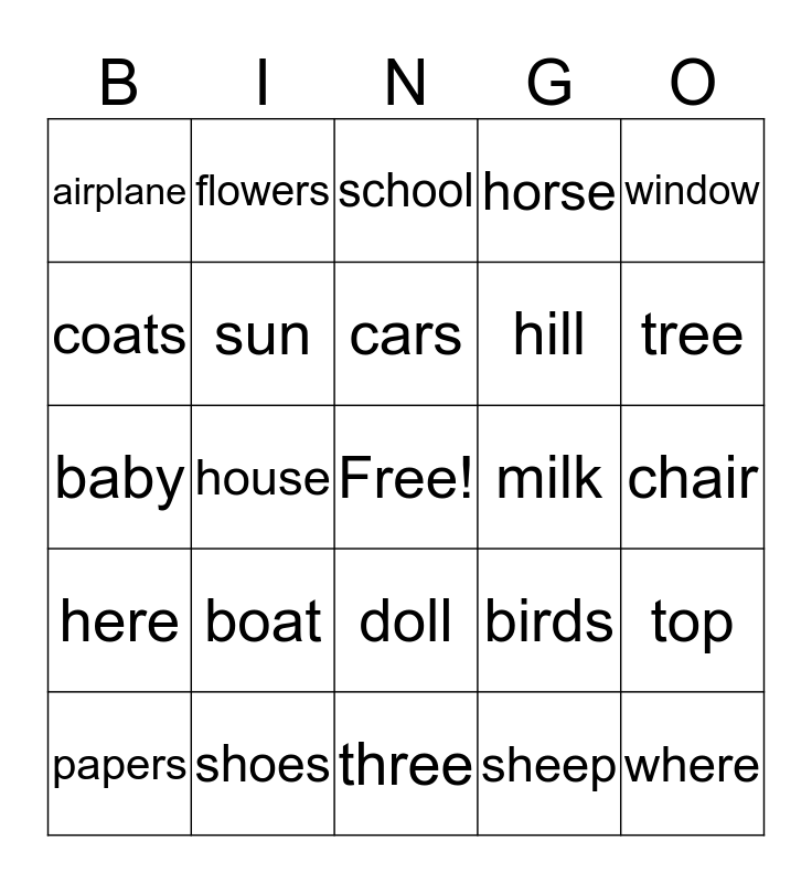 This bingo card has a free space and 24 words: boat, shoes, cars, papers, window, airplane, coats, flowers, milk, doll, hill, baby, birds, top, sun, sheep, chair, school, tree, house, where, here, horse and three.