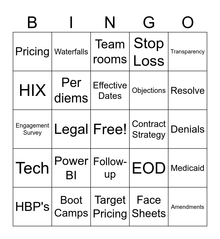 This bingo card has a free space and 32 words: Tenative, Follow-up, EOD, Overview, HIX, Waterfalls, Effective Dates, Face Sheets, Transparency, HBP's, Per diems, Stop Loss, Amendments, ATB, Power BI, QlikView, I-Plans, Denials, Engagement Survey, Boot Camps, Target Pricing, Bandwith, Medicaid, Tech, Legal, Team rooms, Objections, Resolve, Pricing, Medicaid, Target and Contract Strategy.