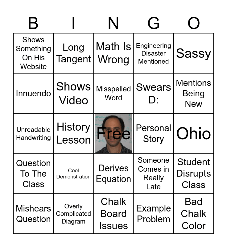 This bingo card has a free space and 34 words: Breaks Chalk, Example Problem, Weird Noise, Tech Issues, Question To The Class, Shows Video, Sassy, Mishears Question, Long Tangent, Drops Something, Misspelled Word, Math Is Wrong, Impossible Warm-up, Warm-Up In Last 25 Minutes, Personal Story, Mentions Being New, Overly Complicated Diagram, Unreadable Handwriting, Cool Demonstration, Someone Comes in Really Late, Derives Equation, Funny Joke, Shows Something On His Website, Ohio, Chalk Board Issues, Bad Chalk Color, Engineering Disaster Mentioned, TA's Mentioned, Swears D:, Innuendo, Jumps Around Topics, History Lesson, Student Disrupts Class and Weird Face.