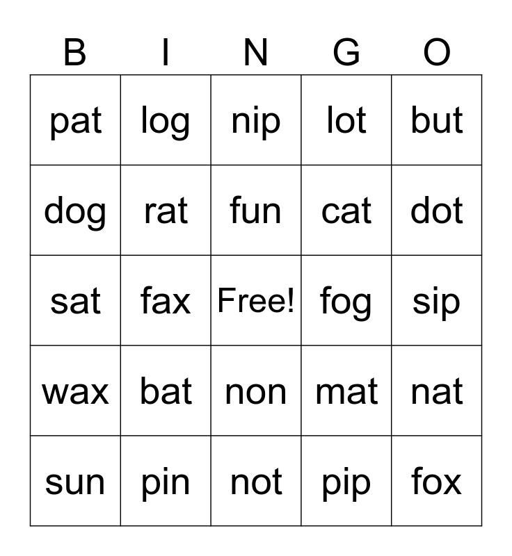 This bingo card has a free space and 24 words: bat, pin, fun, sun, but, pat, dog, log, fog, non, cat, sat, mat, nat, rat, pip, sip, nip, dot, fax, fox, wax, lot and not.