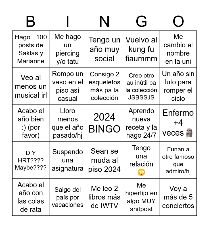 This bingo card has a free space and 24 words: Suspendo una asignatura, Salgo del país por vacaciones, Consigo 2 esqueletos más pa la colección, Acabo el año con las colas de rata, Me cambio el nombre en la uni, Hago +100 posts de Saklas y Marianne, Veo al menos un musical irl, Me hago un piercing y/o tatu, Aprendo nueva receta y la hago 24/7, Sean se muda al piso 2024, Creo otro au inútil pa la colección JSBSSJS, Acabo el año bien :) (por favor), Tengo una relación 😳, Funan a otro famoso que admiro/hj, Rompo un vaso en el piso así casual, Me hiperfijo en algo MUY shitpost, Enfermo +4 veces🗿, Tengo un año muy social, Un año sin luto para romper el ciclo, Lloro menos que el año pasado/hj, Voy a más de 5 conciertos, DIY HRT???? Maybe????, Vuelvo al kung fu fiaummm and Me leo 2 libros más de IWTV.