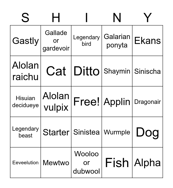 This bingo card has a free space and 24 words: Starter, Mewtwo, Ditto, Eeveelution, Ekans, Gastly, Alolan raichu, Gallade or gardevoir, Applin, Sinistea, Shaymin, Hisuian decidueye, Wurmple, Dog, Cat, Fish, Dragonair, Legendary bird, Sinischa, Alolan vulpix, Alpha, Legendary beast, Galarian ponyta and Wooloo or dubwool.