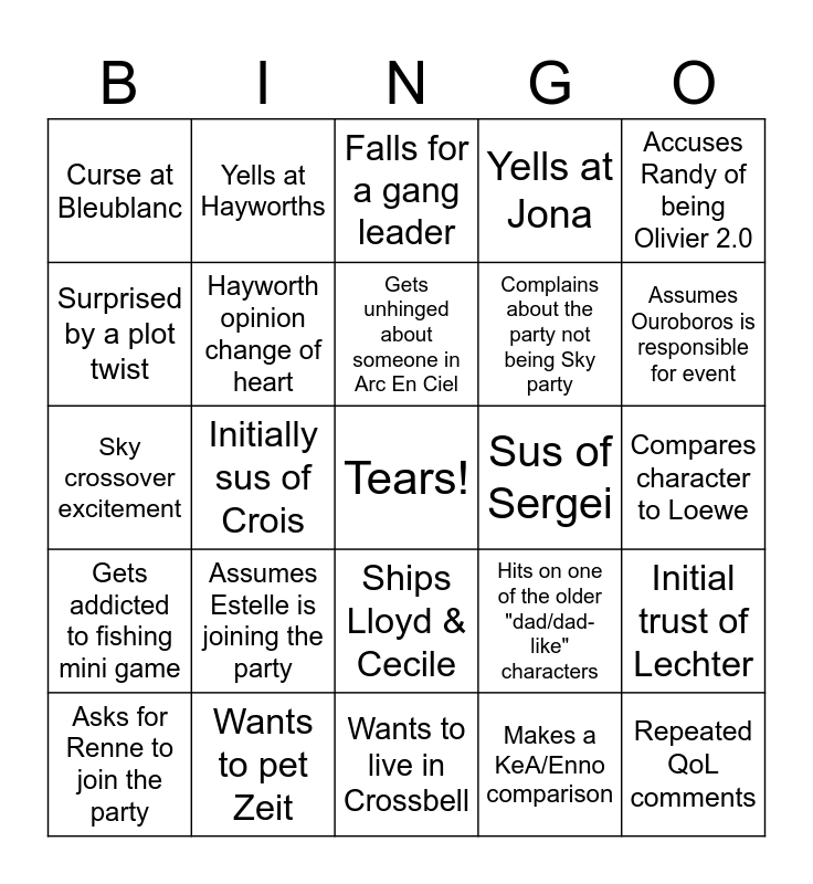 This bingo card has a free space and 24 words: Assumes Estelle is joining the party, Wants to pet Zeit, Gets unhinged about someone in Arc En Ciel, Asks for Renne to join the party, Accuses Randy of being Olivier 2.0, Curse at Bleublanc, Surprised by a plot twist, Yells at Hayworths, Sus of Sergei, Ships Lloyd & Cecile, Complains about the party not being Sky party, Sky crossover excitement, Hits on one of the older "dad/dad-like" characters, Initial trust of Lechter, Hayworth opinion change of heart, Makes a KeA/Enno comparison, Compares character to Loewe, Falls for a gang leader, Assumes Ouroboros is responsible for event, Initially sus of Crois, Repeated QoL comments, Gets addicted to fishing mini game, Yells at Jona and Wants to live in Crossbell.