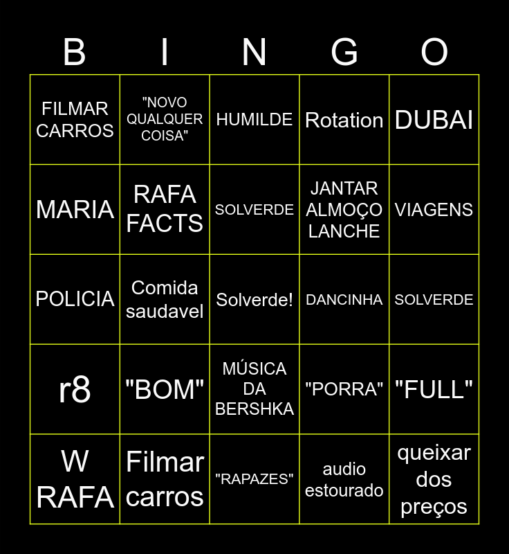 This bingo card has a free space and 25 words: "BOM", "RAPAZES", SOLVERDE, W RAFA, DUBAI, FILMAR CARROS, MARIA, "NOVO QUALQUER COISA", DANCINHA, MÚSICA DA BERSHKA, JANTAR ALMOÇO LANCHE, POLICIA, "PORRA", "FULL", RAFA FACTS, AGUA COM GÁS, SOLVERDE, HUMILDE, VIAGENS, Comida saudavel, queixar dos preços, Filmar carros, r8, Rotation and audio estourado.