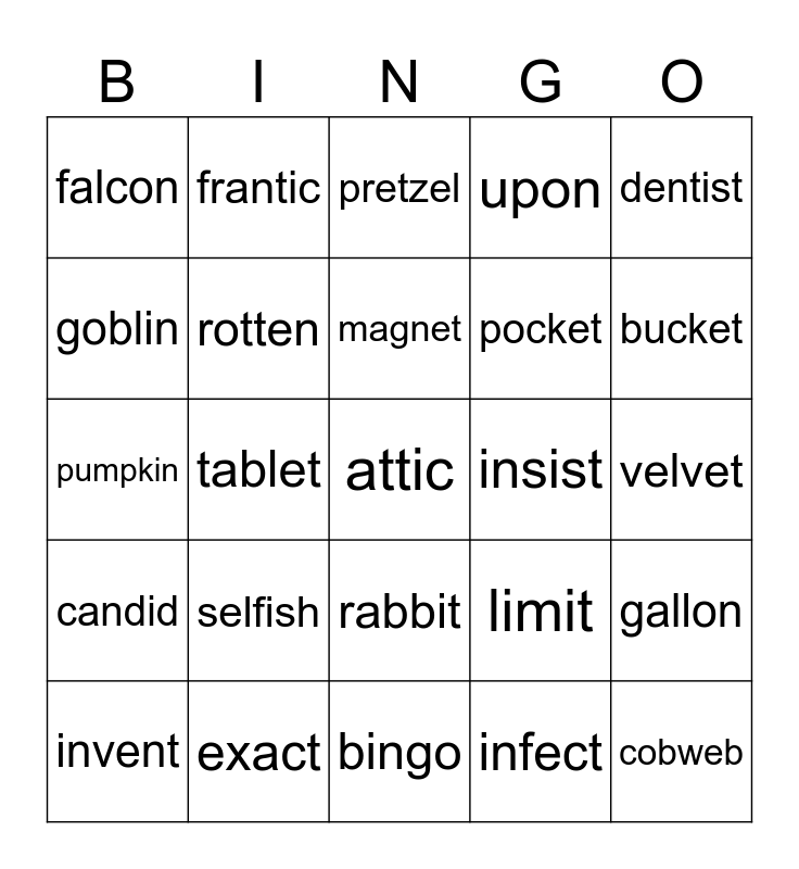 This bingo card has a free space and 24 words: selfish, exact, magnet, invent, dentist, falcon, goblin, frantic, insist, rabbit, pocket, pumpkin, limit, gallon, rotten, infect, velvet, pretzel, bucket, tablet, cobweb, candid, upon and bingo.