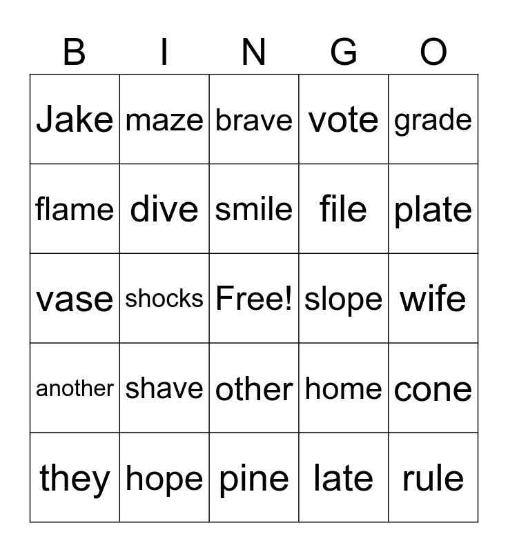 This bingo card has a free space and 29 words: they, from, shocks, whale, Jake, brave, dive, shave, slope, hope, wife, rule, pine, late, plate, friend, other, another, grade, vase, home, cube, file, flame, vote, maze, cone, smile and slope.