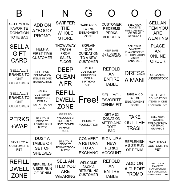 This bingo card has a free space and 59 words: DEEP CLEAN A FR, SELL ALL 3 BRANDS TO ONE CUSTOMER, TELL A CUSTOMER ABOUT YOUR FAVORITE DENIM FIT, SELL TWO FOUNDATION ITEMS IN ONE TRANSACTION, REFILL DWELL ZONE, REPLENISH A SIZE RUN OF DENIM, SELL AN ITEM YOU ARE WEARING, HELP A CUSTOMER SHOPPING FOR A BIRTHDAY GIFT, HELP A FIRST TIME CUSTOMER, SAY HI TO A CUSTOMER’S PET, TAKE A KID TO THE ENGAGMENT ZONE, SELL YOUR FAVORITE PEN/NOTEBOOK IN TYPO, SELL YOUR FAVORITE MUSICIAN/BAND OR BRAND GRAPHIC T, FIRST TO WELCOME 3 GUESTS *IF NOT* ZONED IN FRONT ZONE, REFOLD AN ENTIRE TABLE, SELL YOUR FAVORITE DONATION TOTE BAG, SELL YOUR FAVORITE FLAVOR/SCENT OF FOUNDATION MINTS/ SANATIZER, CUSTOMER REDEEMS PERKS VOUCHER, CALL ANOTHER LOCATION FOR ITEM CHECK, SELL A GIFT CARD, PLACE AN ONLINE ORDER, SWIFFER THE WHOLE STORE, ORGANIZE UNDERSTOCK, DRESS A MANI, WAP + FOUNDATION, PERKS + FOUNDATION, PERKS +WAP, OPEN A FITTING ROOM FOR 3 GUESTS, THOW AWAY TRASH FROM SALES FLOOR, TAKE OUT THE TRASH, ADD ON AN ITEM IN THE FITTING ROOM, DUST A TABLE OR SET OF SHELVES, WELCOME BACK A RETURNING CUSTOMER, ADD ON A "2 FOR" PROMO, ADD ON A "BOGO" PROMO, SELL YOU FAVORITE DENIM FIT, CONVERT A RETURN TO AN EXCHANG, HELP SAME CUSTOMER @ FLOOR+FR+POS, GET A $2 DONATION AFTER A NO TOTE BAG, EXPLAIN OUR OUNDATION TO A NEW CUSTOMER, SIGN UP A NEW PERKS ACCOUNT, DEEP CLEAN A FR, SELL ALL 3 BRANDS TO ONE CUSTOMER, TELL A CUSTOMER ABOUT YOUR FAVORITE DENIM FIT, SELL TWO FOUNDATION ITEMS IN ONE TRANSACTION, REFILL DWELL ZONE, REPLENISH A SIZE RUN OF DENIM, SELL AN ITEM YOU ARE WEARING, HELP A CUSTOMER SHOPPING FOR A BIRTHDAY GIFT, HELP A CUSTOMER SHOPPING FOR AN OUTFIT TO AN EVENT, HELP A FIRST TIME CUSTOMER, SAY HI TO A CUSTOMER’S PET, TAKE A KID TO THE ENGAGMENT ZONE, SELL YOUR FAVORITE PEN/NOTEBOOK IN TYPO, SELL YOUR FAVORITE MUSICIAN/BAND OR BRAND GRAPHIC T, REFOLD AN ENTIRE TABLE, SELL YOUR FAVORITE DONATION TOTE BAG, SELL YOUR FAVORITE FLAVOR/SCENT OF FOUNDATION MINTS/SANATIZER and FIRST TO WELCOME 3 GUESTS *IF NOT* ZONED IN FRONT ZONE.
