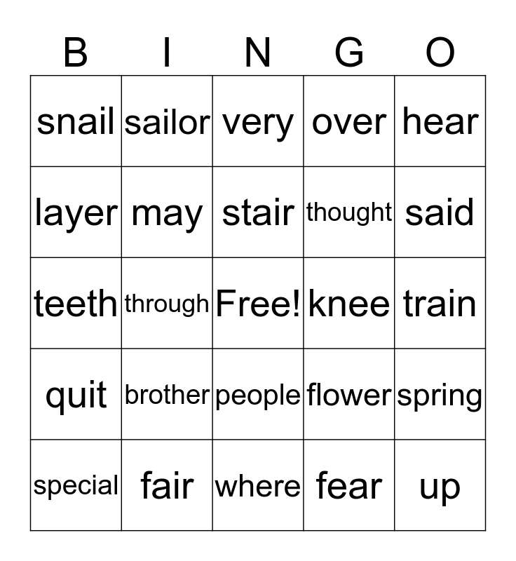 This bingo card has a free space and 24 words: brother, fair, stair, special, hear, snail, layer, sailor, knee, people, thought, teeth, flower, spring, may, fear, train, very, said, through, up, quit, over and where.
