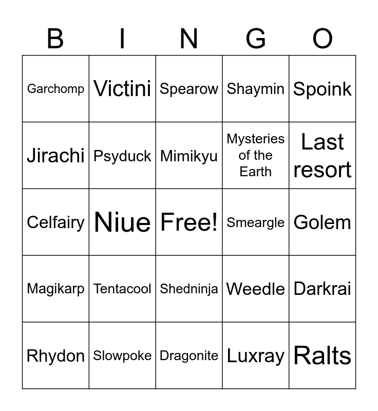 This bingo card has a free space and 29 words: Rhydon, Ruby, Niue, Foxfire, Garchomp, Spearow, Psyduck, Tentacool, Smeargle, Slowpoke, Golem, Ralts, Dragonite, Luxray, Last resort, Kingler, Shedninja, Magikarp, Spoink, Celfairy, Weedle, Rotom, Mysteries of the Earth, Jirachi, Shaymin, Victini, Darkrai, Mimikyu and Ditto.