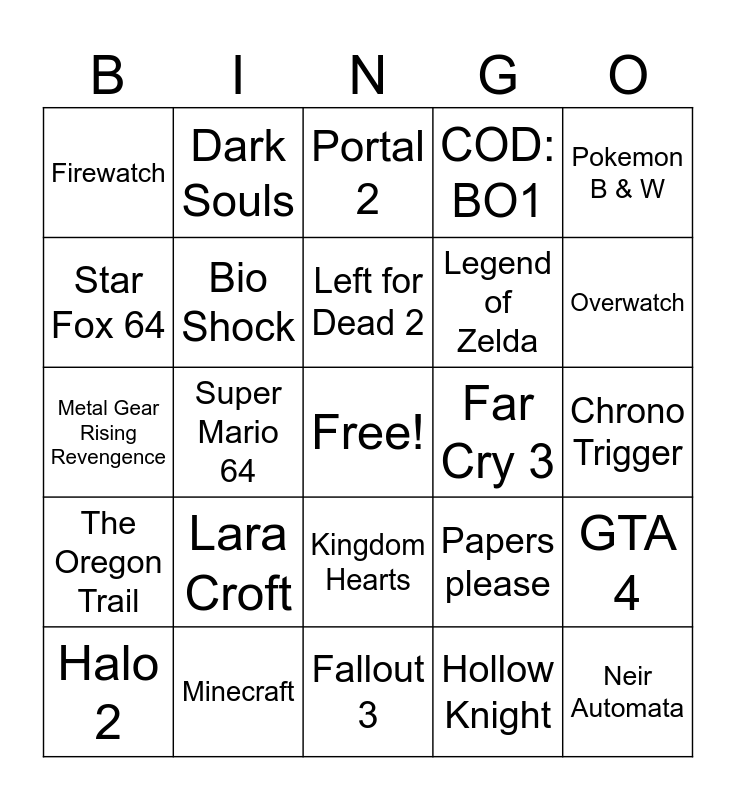This bingo card has a free space and 27 words: Papers please, Skyrim, Legend of Zelda, Fallout 3, Star Fox 64, Portal 2, Dark Souls, The Oregon Trail, Far Cry 3, GTA 4, Metal Gear Rising Revengence, COD: BO1, Halo 2, Minecraft, Overwatch, Read Dead Redemption 2, Bio Shock, Left for Dead 2, Lara Croft, Firewatch, Chrono Trigger, Hollow Knight, Super Mario 64, Neir Automata, Kingdom Hearts, Pokemon B & W and Gears of War.