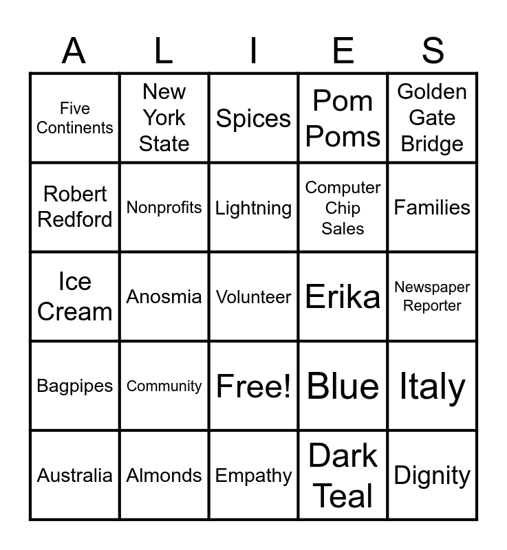 This bingo card has 26 words: Free!, Dark Teal, Lightning, Almonds, Golden Gate Bridge, Five Continents, Robert Redford, New York State, Newspaper Reporter, Blue, Computer Chip Sales, Ice Cream, Italy, Australia, Anosmia, Galapagos Islands, Pom Poms, Bagpipes, Spices, Volunteer, Families, Empathy, Erika, Community, Nonprofits and Dignity.