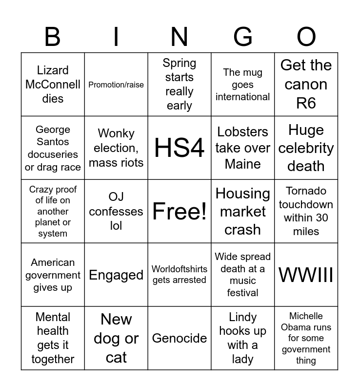 This bingo card has a free space and 24 words: Engaged, New dog or cat, HS4, Mental health gets it together, Get the canon R6, Lizard McConnell dies, George Santos docuseries or drag race, Promotion/raise, Housing market crash, Worldoftshirts gets arrested, Lobsters take over Maine, Crazy proof of life on another planet or system, Wide spread death at a music festival, WWIII, Wonky election, mass riots, Lindy hooks up with a lady, Tornado touchdown within 30 miles, Spring starts really early, Huge celebrity death, OJ confesses lol, Michelle Obama runs for some government thing, American government gives up, The mug goes international and Genocide.