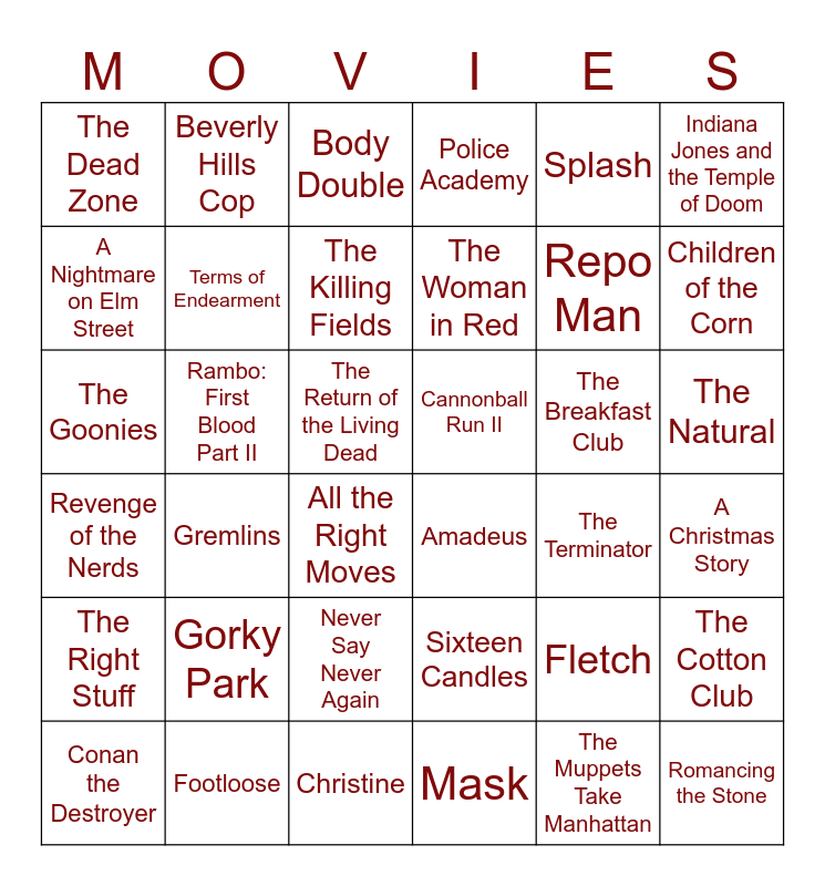 This bingo card has 48 words: Ghostbusters, The Goonies, Scarface, The Terminator, The Breakfast Club, Sixteen Candles, Beverly Hills Cop, The Karate Kid, Indiana Jones and the Temple of Doom, Footloose, A Nightmare on Elm Street, Police Academy, Gremlins, Revenge of the Nerds, Romancing the Stone, Never Say Never Again, Terms of Endearment, Rambo: First Blood Part II, Friday the 13th: The Final Chapter, Splash, Children of the Corn, A Christmas Story, The Dead Zone, The Killing Fields, Desperately Seeking Susan, The Woman in Red, All the Right Moves, Purple Rain, The Natural, Cannonball Run II, Friday the 13th: A New Beginning, Gorky Park, The Muppets Take Manhattan, Dune, Amadeus, Christine, Mask, The Return of the Living Dead, Conan the Destroyer, The Big Chill, Fletch, The Right Stuff, Body Double, Yentl, Repo Man, Police Academy 2: Their First Assignment, The Cotton Club and The Flamingo Kid.